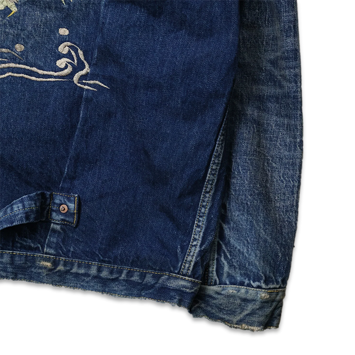 定番の2107 Type 1ジャケットに鷹と富士山の刺繍を施したデニムジャケットタイプのスカジャンに(More Than Real)を施した中古加工バージョン。