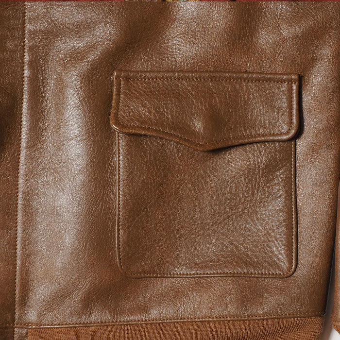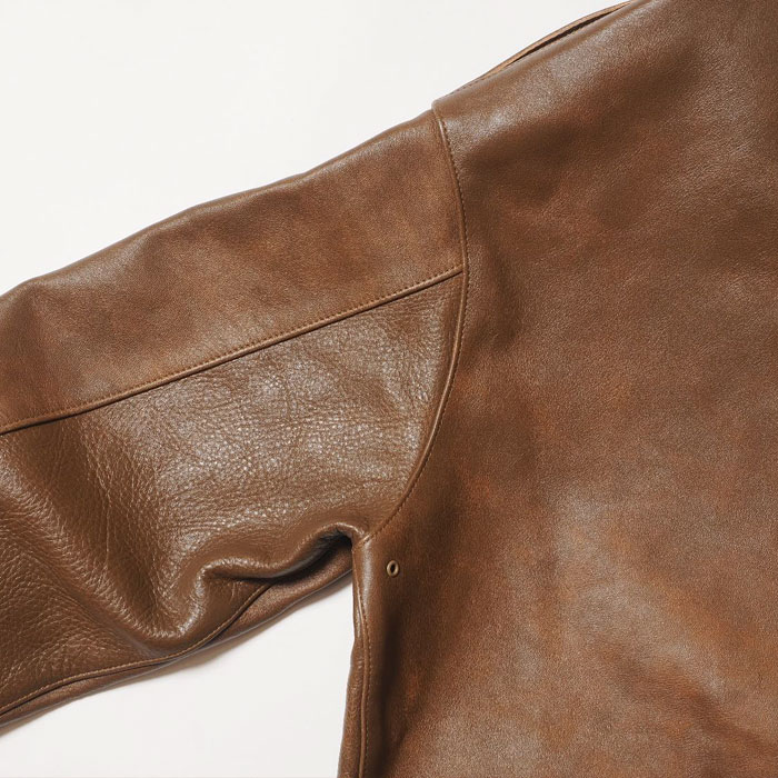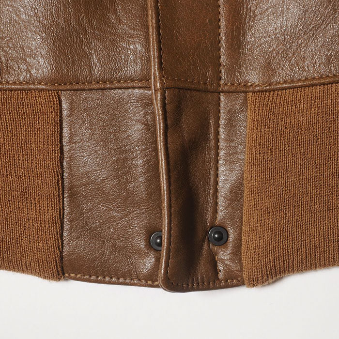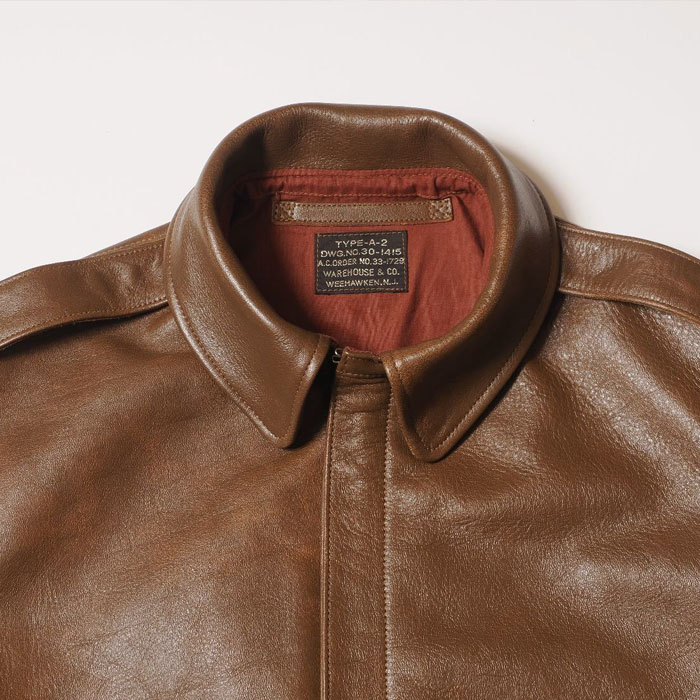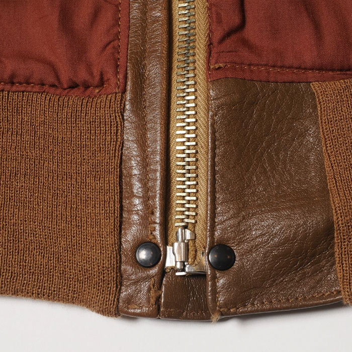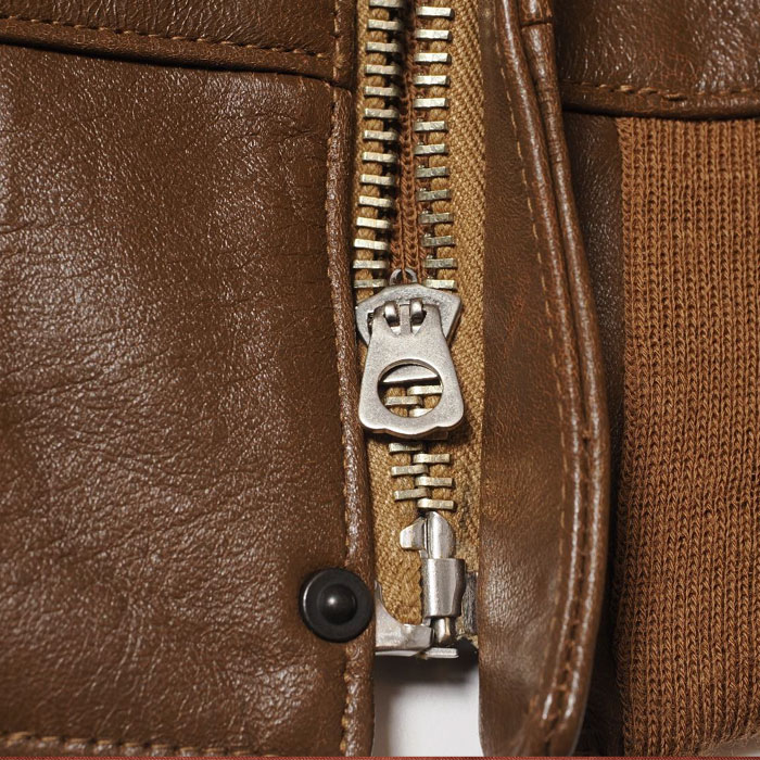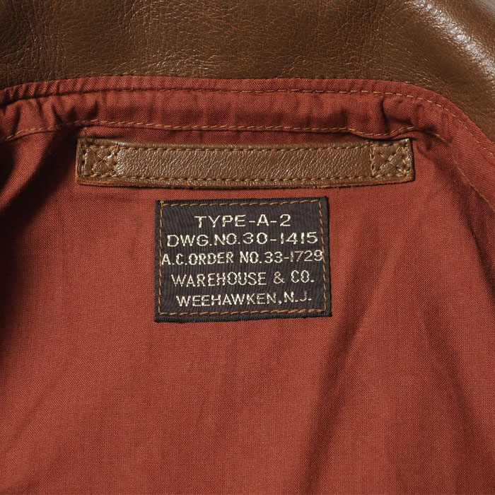 1931年から始まった,その納入業者の筆頭に立っていた「Werber Leather Coat Co社」は当初、ポケットフラップにA-1ジャケットと同じ、穴かがりのボタンを付けていました。レザージャケットに関する特許を複数取得するなど、既にクウォーターマスターから信頼を得ていた同社は、その経験を生かしてポケットのフラップをスナップボタン式に改良しました。NRAによる労働組合の発足で、生産工場としてはそれまでよりも多くの制限がかけられていたなかで、「WerberLeatherCoatCo」は軍が求めるコストダウンと機能性のアップデートに成功したのではないでしょうか。こうして1933年、完全なる「TYPEA-2」として最初に納入したものがOrderNo「33-1729」です。そのファーストモデルを、奇跡的にウエアハウスが手にしたのは数年前のことです。それから少しずつ、じっくりと資材の開発が始まり、長い時をかけてようやく誕生することになりました。外観から見た大きな特徴は、リベットが穿たれたファスナーエンドです。1930年代初頭独特のハトメよりも、さらに古いこのジッパーは、まさに最初期のA-2の象徴です。