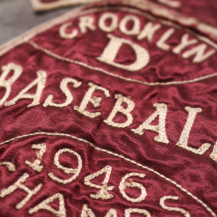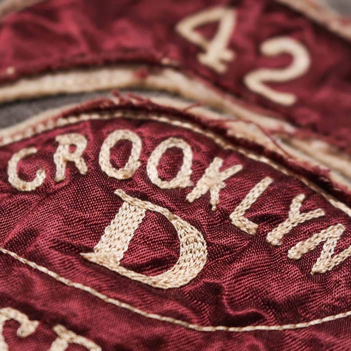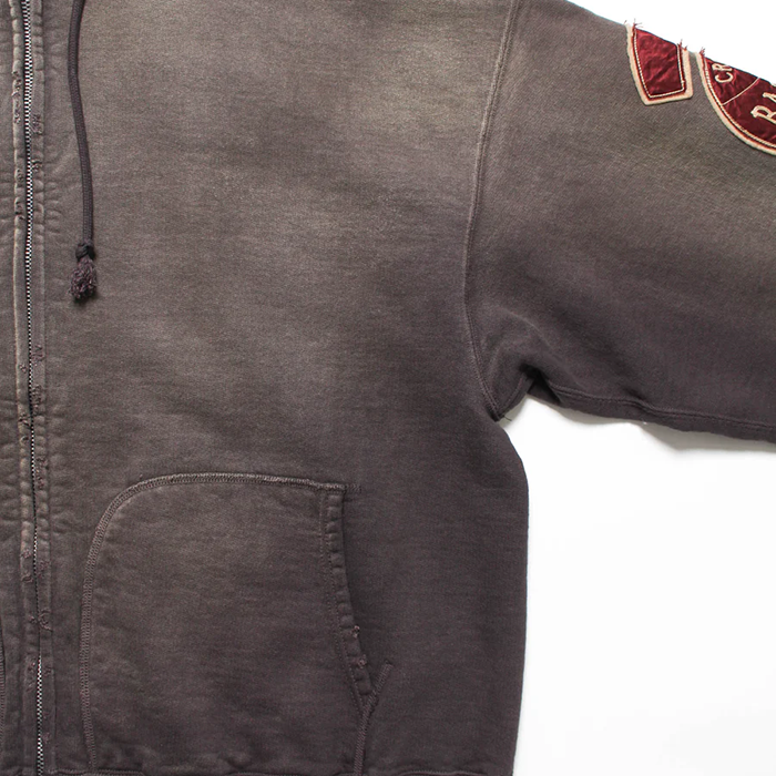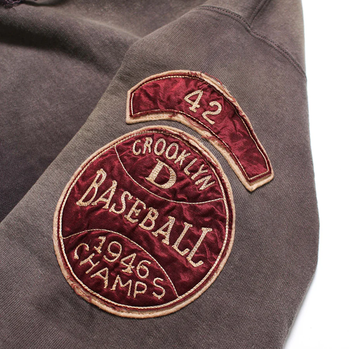 CROOKLYN D の架空チャンピオンパーカを製作。腕に刻む“42”はジャッキー・ロビンソンへのトリビュート、背には“1946 CHAMPS”パッチを配しチーム史の節目を表現。ビンテージライクなシルエットにブランド定番のセパレートポケットを採用。チームカラーのダークブラウンに映えるフェード、アタリ、擦れを重ねた着古し加工で、当時物さながらの存在感へ。