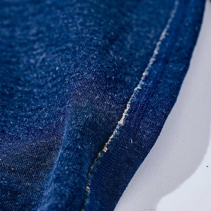 縫製仕様は4本針フラットシーマミシンを使い、メスを調整し表からも柿渋の色味が出るよう施しています。