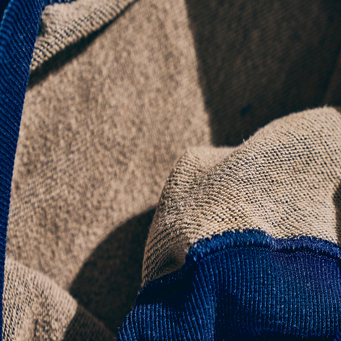 30番手のオープンエンドヤーン糸をインディゴロープ染色し、度詰で編み上げた裏毛になります。オープンエンドヤーンまたは空紡糸と呼ばれる、空気の力で撚りを加えた糸を用いることにより、糸に適度な空気を含み、ドライな質感でロープのあたりがしっかりつく生地となっています。フライス(リブ)においても同じ糸を使い編み立てています。平安時代から衣類に用いられていた柿渋の天然染料で製品染めしております。柿渋がもつ成分より殺菌や堅牢度を高め、その一つであるタンニンが使い込むほどに深みのある色味へと変化していくのが特徴です。
