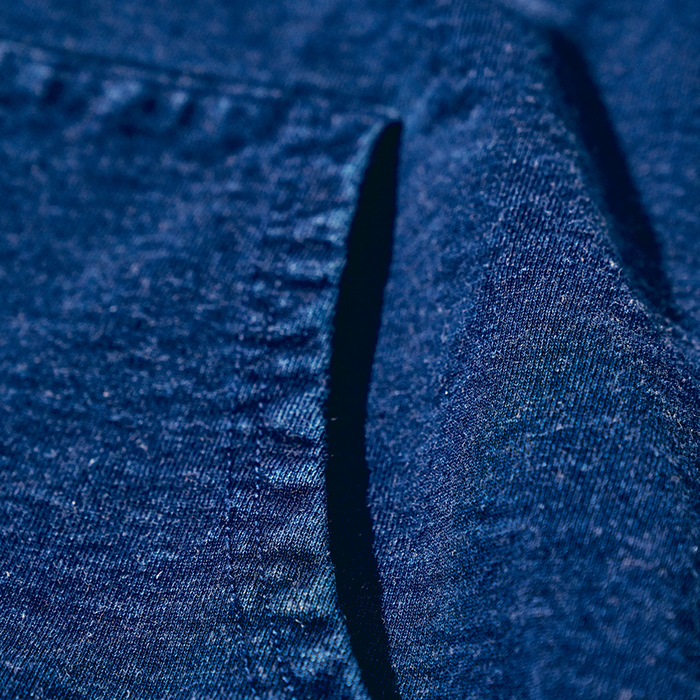 30番手のオープンエンドヤーン糸をインディゴロープ染色し、度詰で編み上げた裏毛になります。オープンエンドヤーンまたは空紡糸と呼ばれる、空気の力で撚りを加えた糸を用いることにより、糸に適度な空気を含み、ドライな質感でロープのあたりがしっかりつく生地となっています。フライス(リブ)においても同じ糸を使い編み立てています。平安時代から衣類に用いられていた柿渋の天然染料で製品染めしております。柿渋がもつ成分より殺菌や堅牢度を高め、その一つであるタンニンが使い込むほどに深みのある色味へと変化していくのが特徴です。