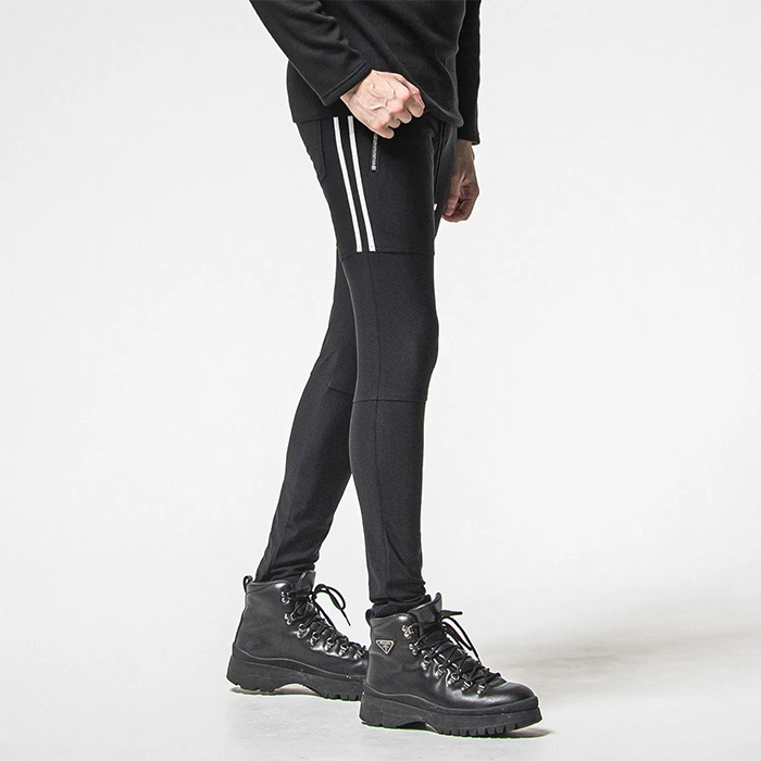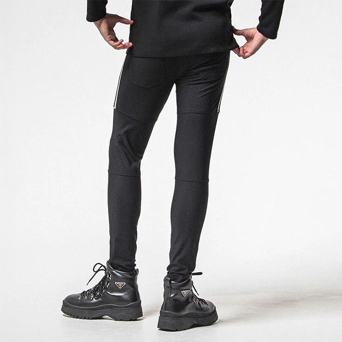 膝の切り替え、高級感のあるエコレザー仕様の2本ラインを膝上まで入れ、サイドポケットはファスナー仕様。