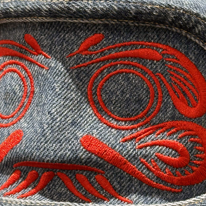 こちらは今井だるまNAYAのだるまをベースに、デニムの産地岡山県井原市にて普段様々なブランドから古着のリメイク依頼をうける職人によって、ハンドメイドで作られております。