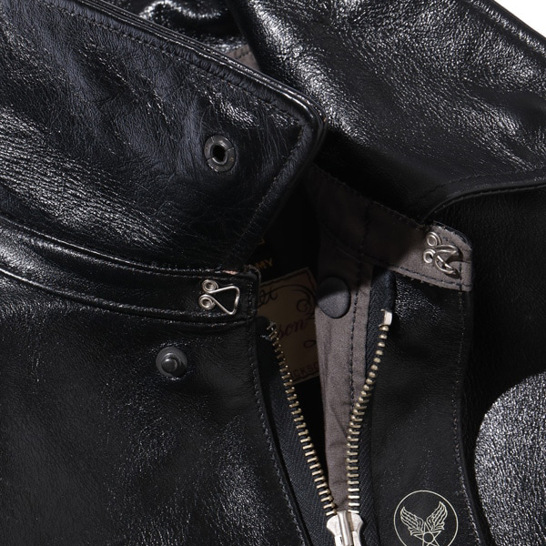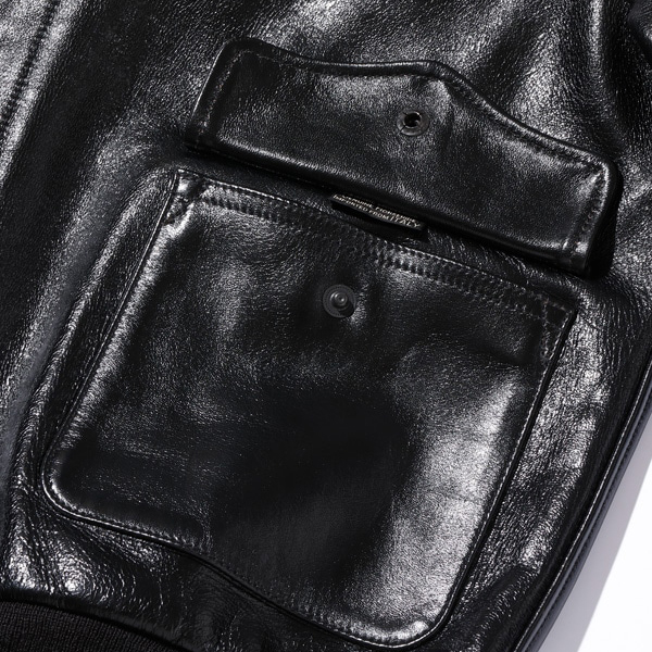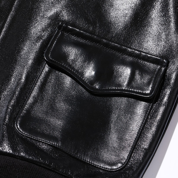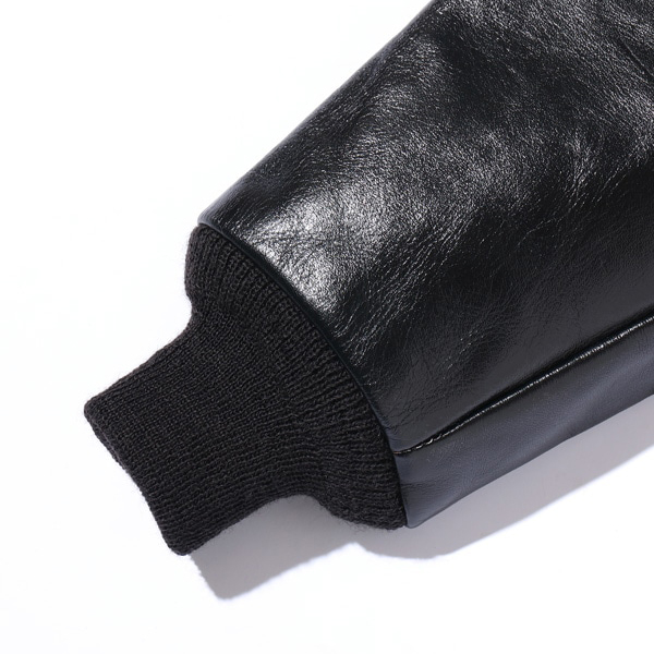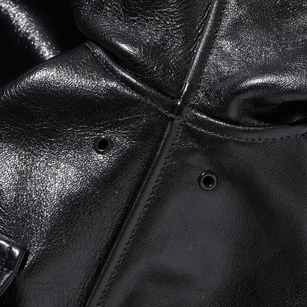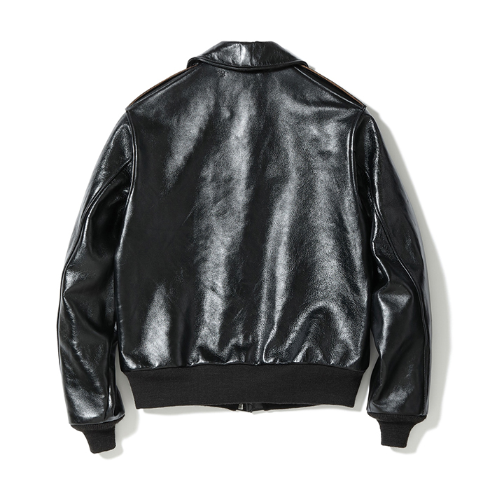 コントラクターのラフウェア社をベースにしたブラックA-2。ベジタブルタンニングで熟成された馬革の芯は茶色で、黒い表面が擦れてくると味わい深い風合いとなる。
