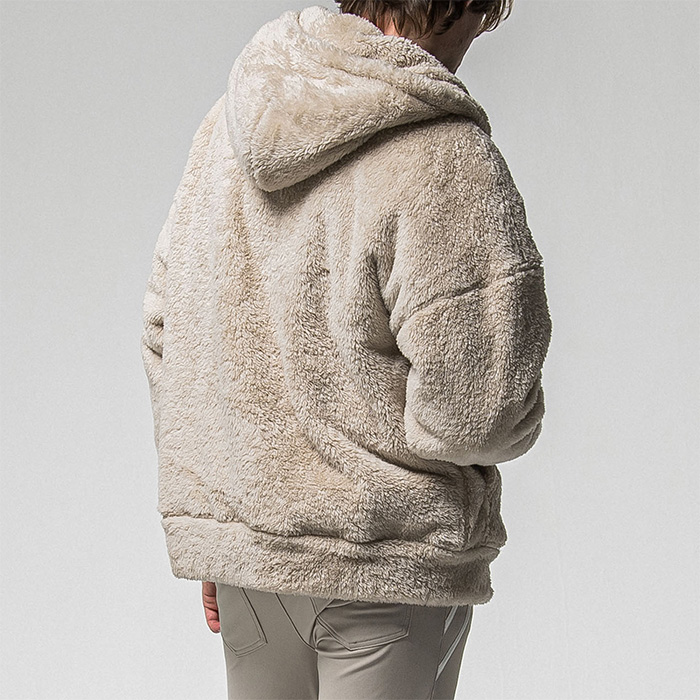 大きめのフードとシンプルなサイドパッチポケットがデザインのアクセントに。