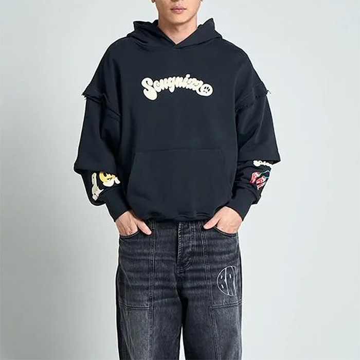 バックにフォークモチーフがプリントされたオーバーサイズダブルフーディー