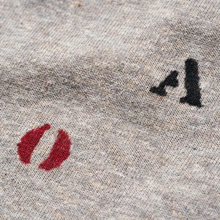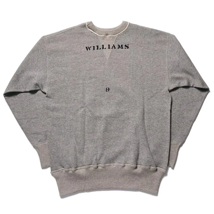 カットソーがウールからコットンに変わった1930年代からある挟み込み仕様の腰リブ。首まわりには伸縮に富むV字のフライスを前後に配した四本針仕様のスウェットです。肩口から垂直に落ちる袖口のセットインスリーブはややソリッドな印象を受けるシンプルなデザインですが、腰帯のバインダー仕様は着込むほどにアタリが生まれます。