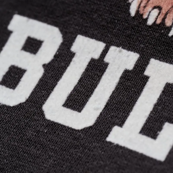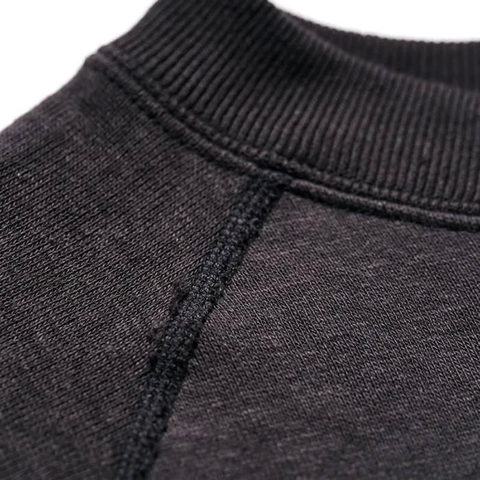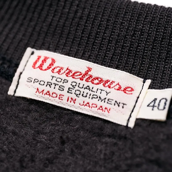 ペナントやスウェットに施されたこれらのフロッキーは、スポーツ観戦や応援など、属する学校や団体の団結のために製造されたものですが、それらは古着となり、年月を経て独特の毛羽立ちや擦れが出て、図柄がなんともいえない味わいに変化しているのが魅力です。ウエアハウスではラグランスウェットのボディーに、これらの新品の状態を再現し、着用と洗濯でヴィンテージのような褪色を楽しんでいただけるフロッキースウェットを製作しました。