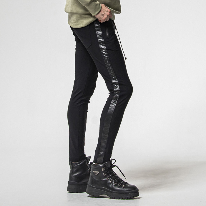 ラグジュアリーな印象に仕上げた、レザー切り替えラインのトラックパンツ。