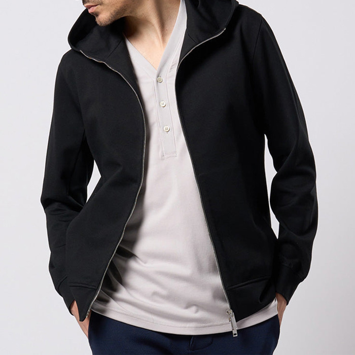 デザインはスタンダードなジップフーディ。フーディに重要な収まり、かぶりを計算したフードパターン。フードに沿うようなジップアップがフード部分の美しい形状をキープ。