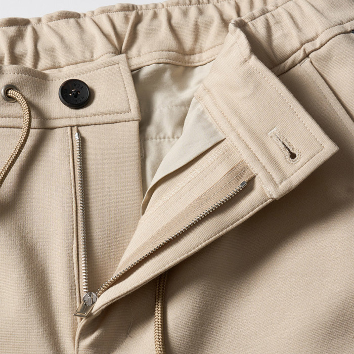 フロントは釦、ファスナーによる前開き仕様にすることで、カジュアルアイテムながら本来のパンツとしての機能、品質を保っている。