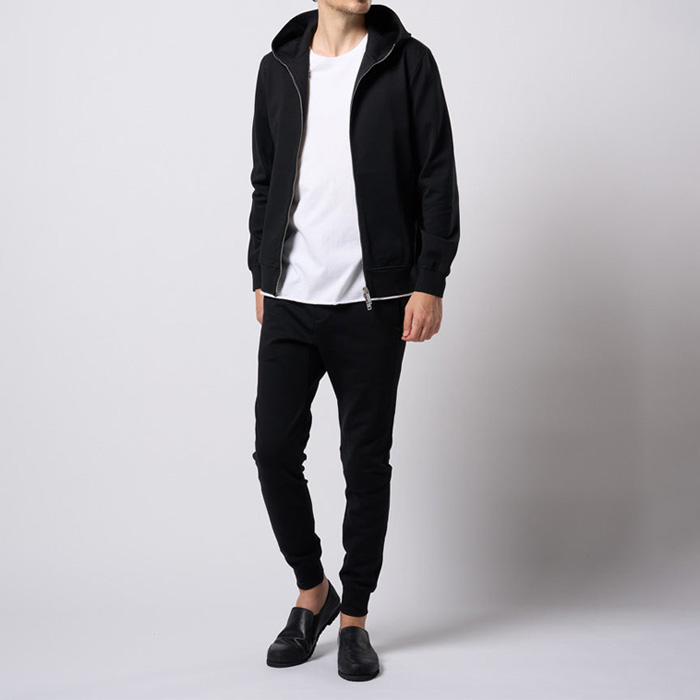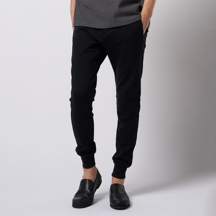 膝にダーツを入れ、膝裏に切り替えを入れることで立体感を演出。股下に施したマチが可動域を広げ、細身のシルエットながらスウェットパンツ本来の動きやすさをキープ。裾リブは共地にし、ソリッドな印象に仕上げている。