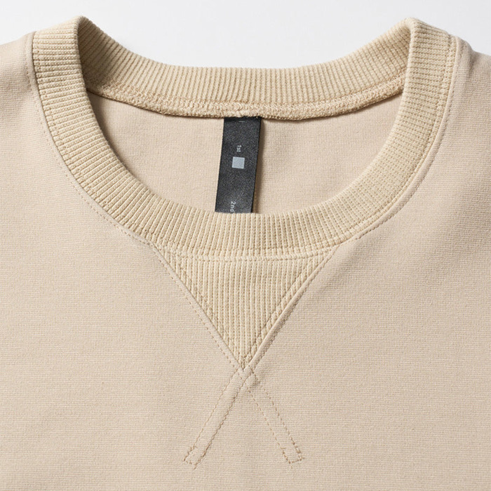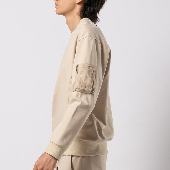 シンプルな前Vスウェットにユーティリティポケットを搭載し、ミリタリーアレンジを加えたスウェットシャツ。
