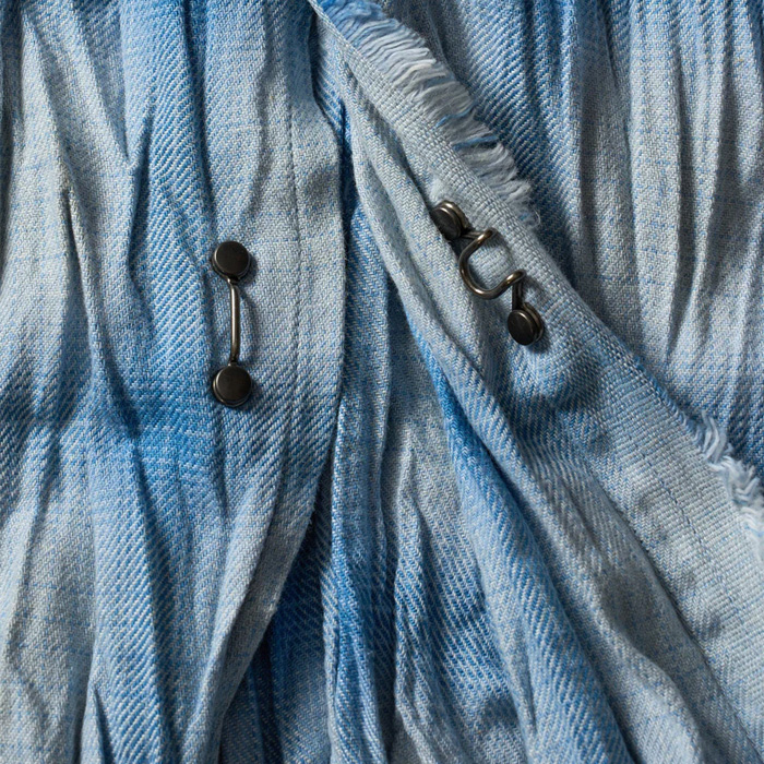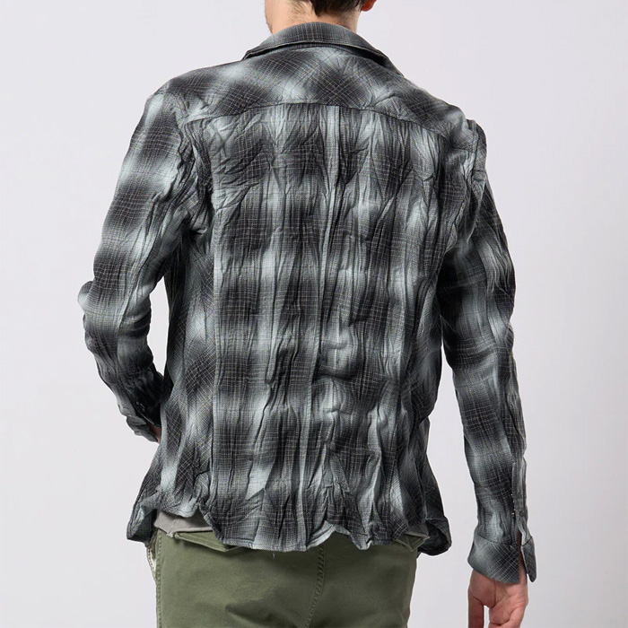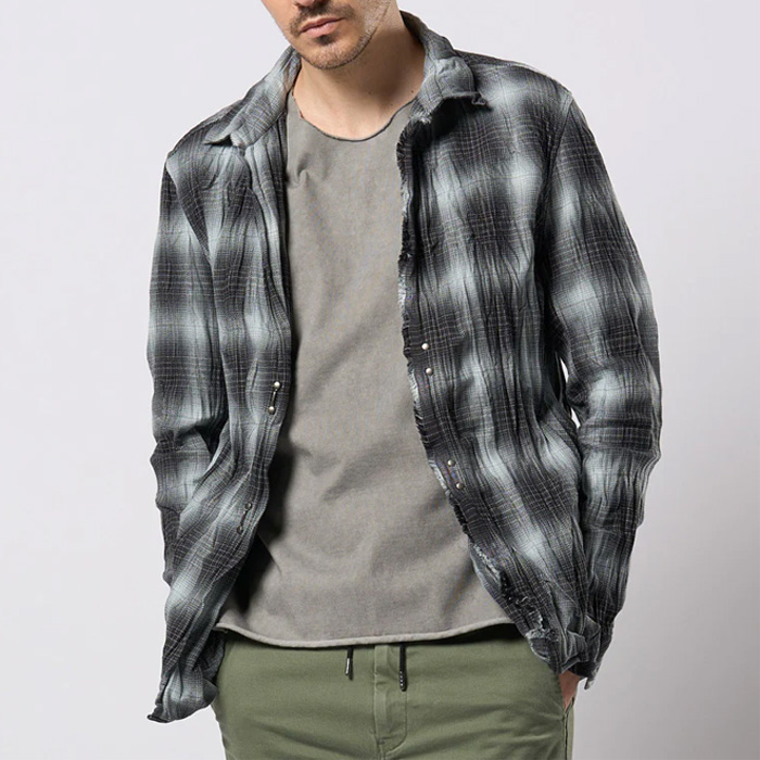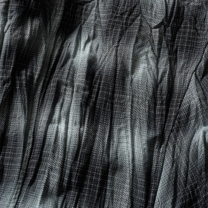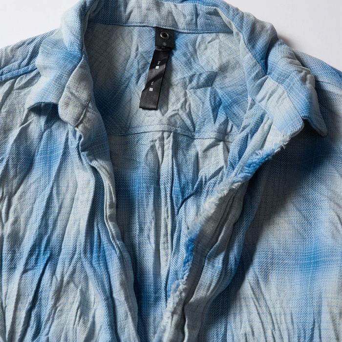 タテヨコ10/1で織りあげた中肉厚のオンブレーチェック素材を採用。インディゴ染料を使用しており、着用~洗いを繰り返すことでデニムの様な経年変化が楽しめる。