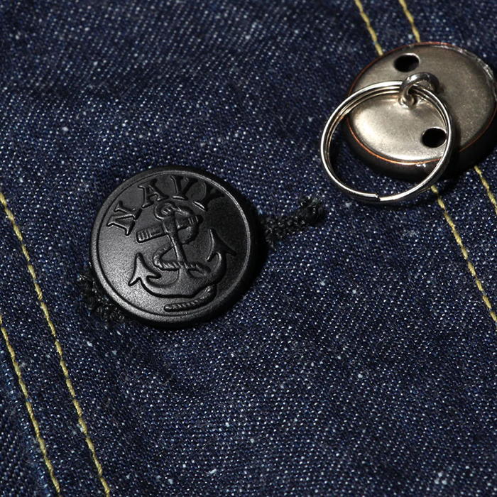 当時の仕様を踏襲し、ボタンホールにはヴィンテージ特有の菊穴を再現。フロントにはUS NAVYの象徴であるイカリマークを刻印したチェンジボタンを採用し、ディテールからも本格的な雰囲気を味わえます。