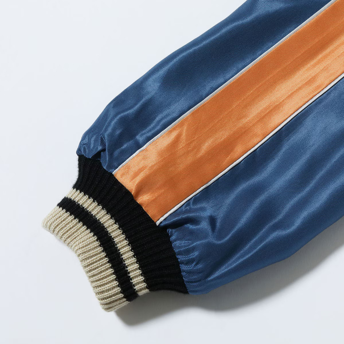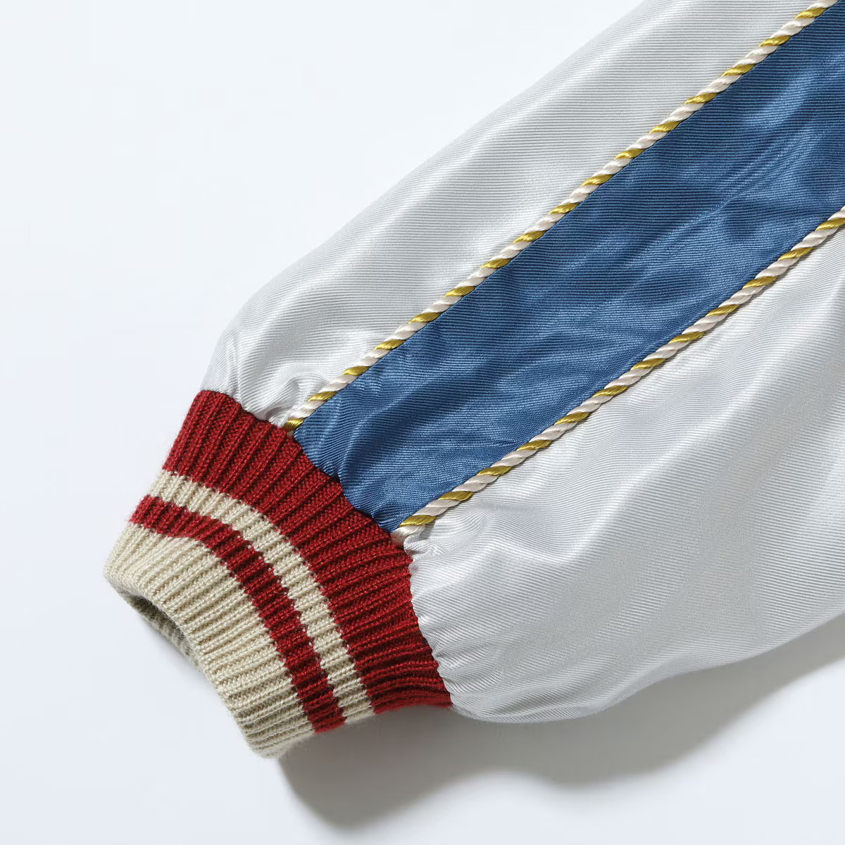 スーベニアジャケットのなかで最もスタンダードな両面にアセテート生地を使ったリバーシブルタイプ。戦後当時のスカジャンには、シルクに似た高級感を持つ物資統制外品目のアセテートが使われていた。中綿がないため季節を問わず着用でき、独特なドレープ感も魅力といえる。