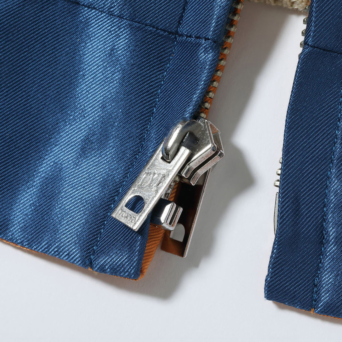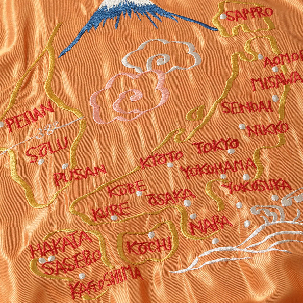 リバーシブル面はジャパンマップ柄。JAPANの文字が無いため日本地図と地名がオレンジのボディに大きく描かれているが、敢えて同系色を使って刺繍糸を馴染ませることで袖と富士山のブルーが際立つように計算されている。また、胸の絵柄は当時同じ刺繍の型で作られていたため両面とも同じ柄だが、よく見ると表裏のボディの色に合わせて異なる色糸で刺繍されており、これもヴィンテージに準じた仕様。
