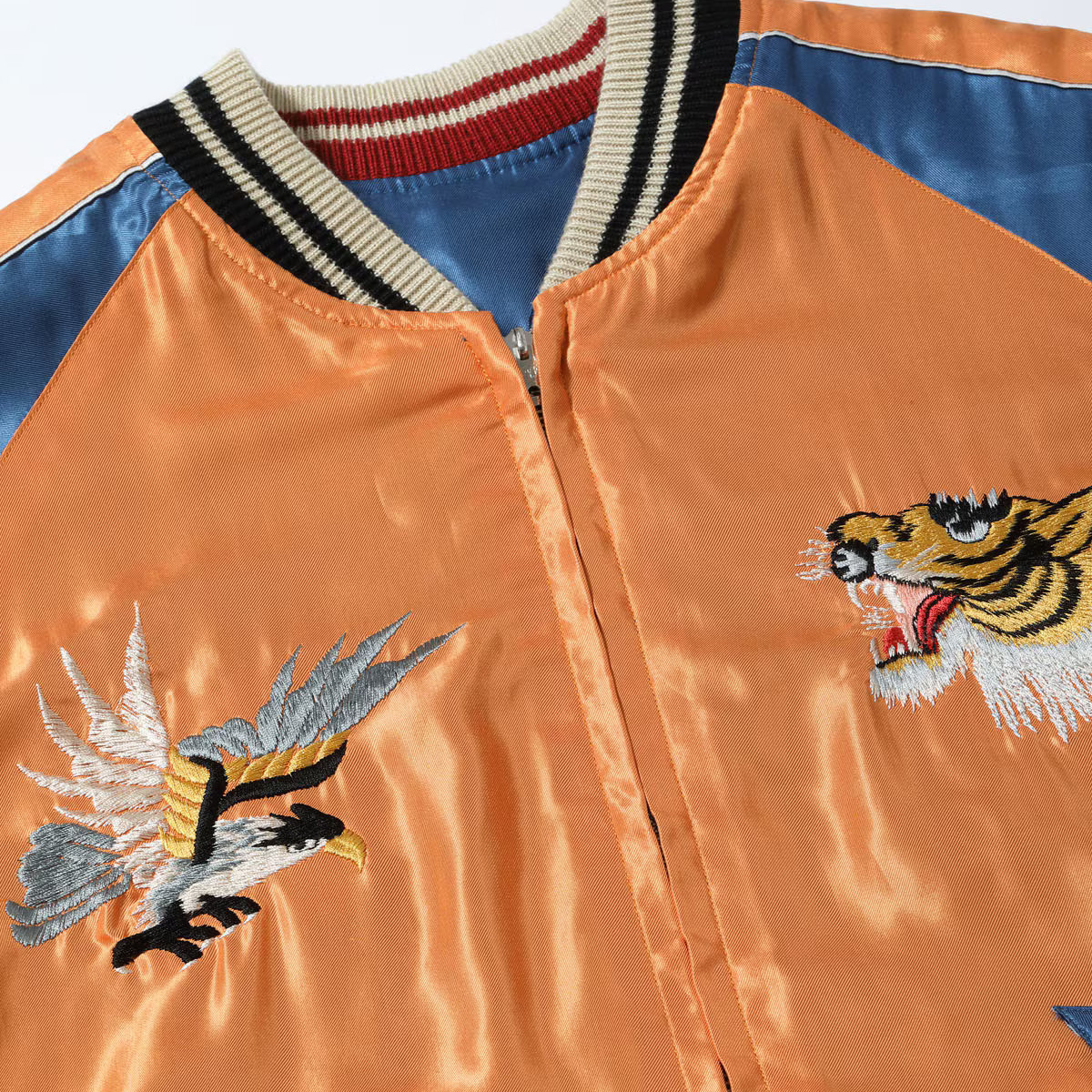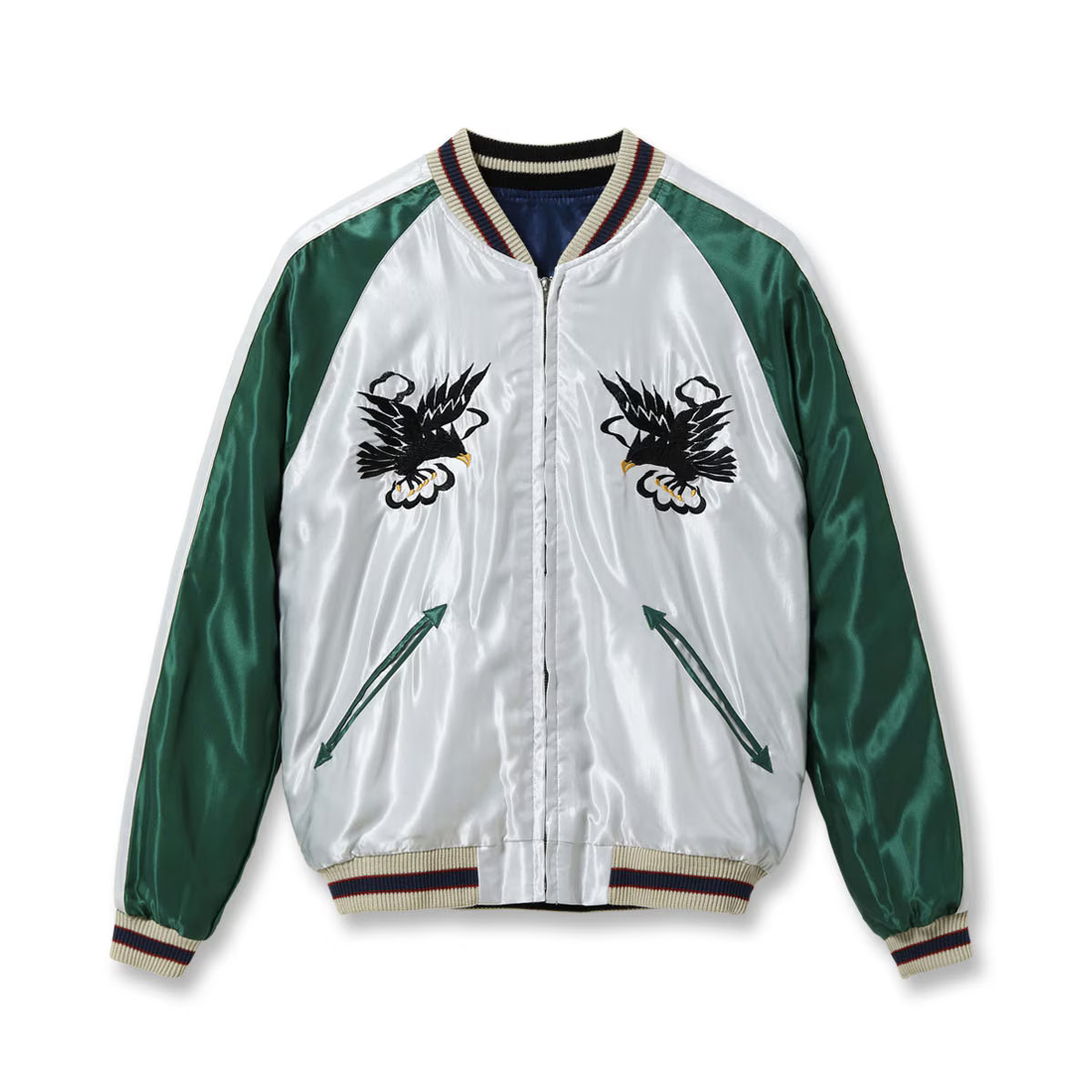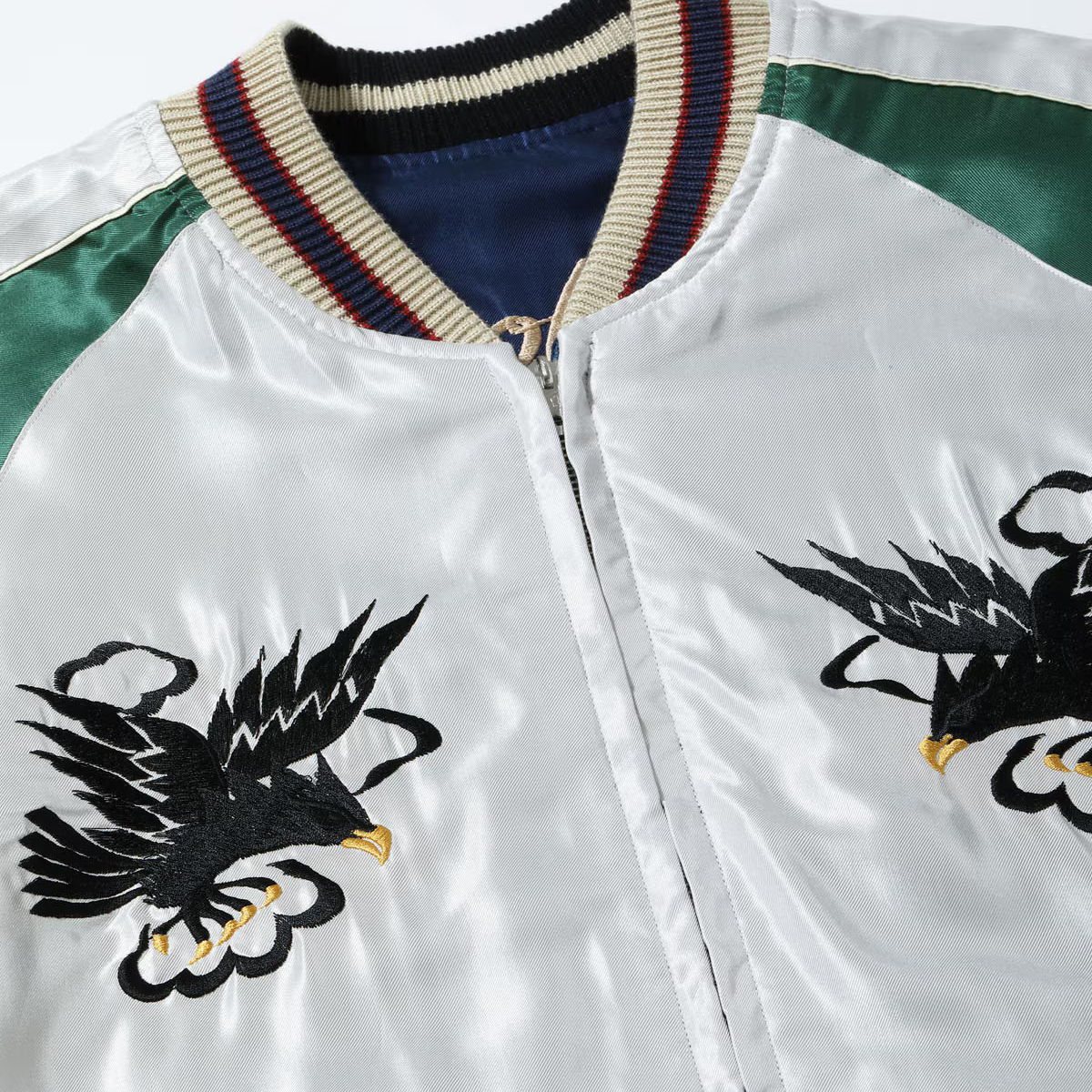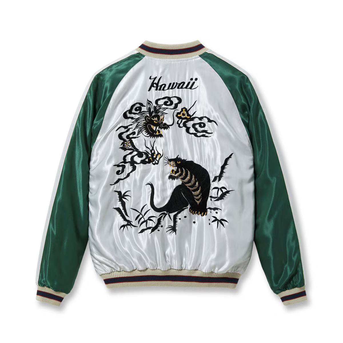 リバーシブル面は、龍虎が睨み合う「和」の絵柄。ハワイのPX(基地内の売店)で売られていたスカジャンだが、日本から輸出されていたため、背中にHAWAIIの文字がありながら絵柄はオリエンタルという和洋折衷な組み合わせとなっている。ボディはシルバー×グリーンの「逆配色」で、明るい色がメインカラーとなった南国ハワイを想わせる爽やかな仕上がり。