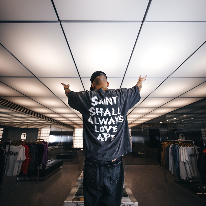 BAPEのアイコンを起点に、SAINT Mxxxxxxのフィルターを通して再構築し、両ブランドの世界観が交差するアイコニックなコレクションが完成しました。