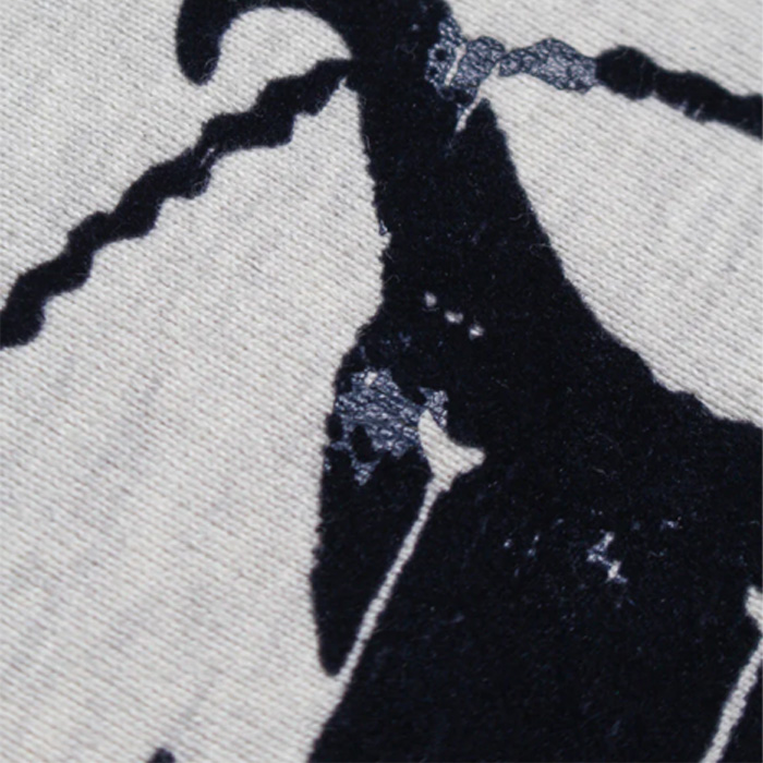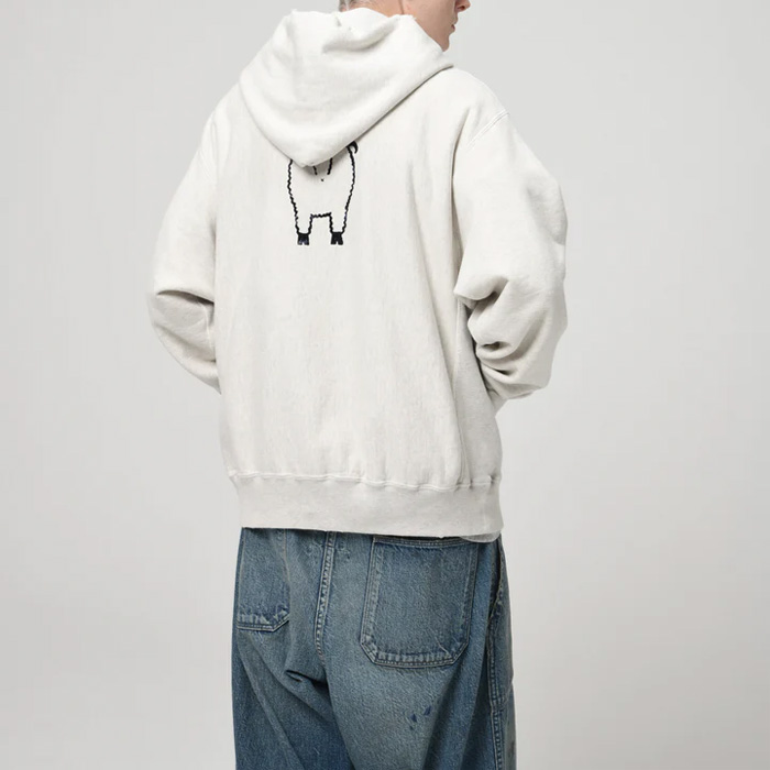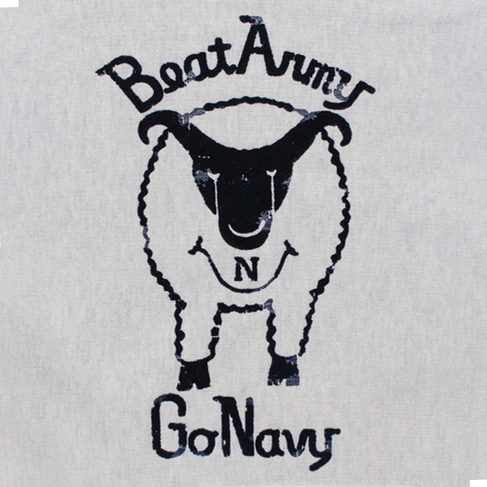 ヴィンテージTシャツに見られる羊モチーフのフロッキープリントデザインを下敷きに、「BEAT ARMY」のフットボールカルチャーを掛け合わせたグラフィックをフーディに展開。US NAVYモチーフのGOATへ置き換えることで、ミリタリーとアメリカンユーモアが交差するパロディ表現に仕上げている。