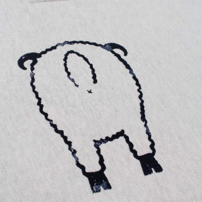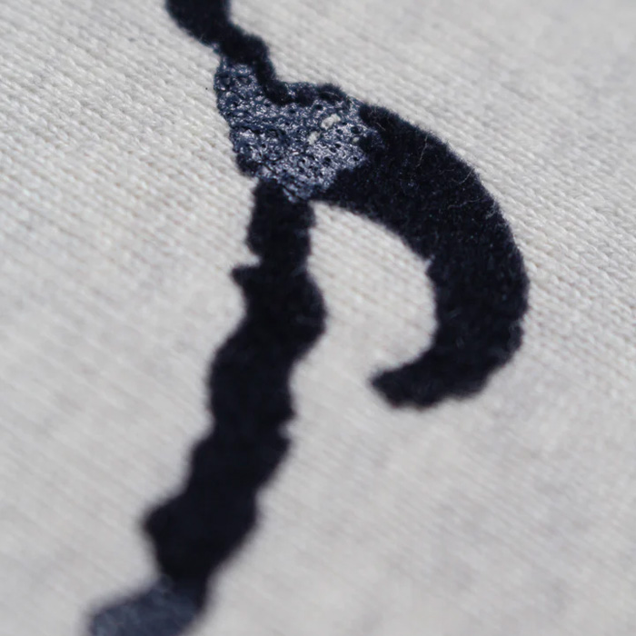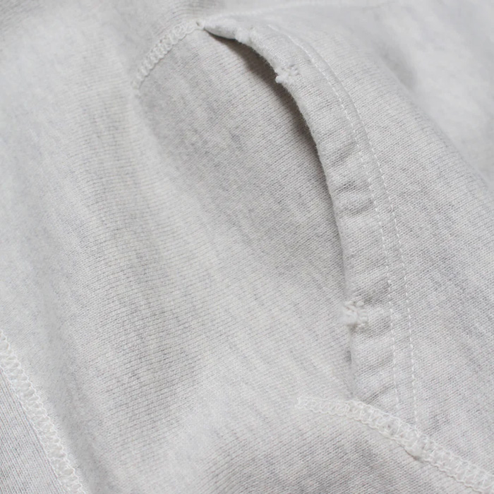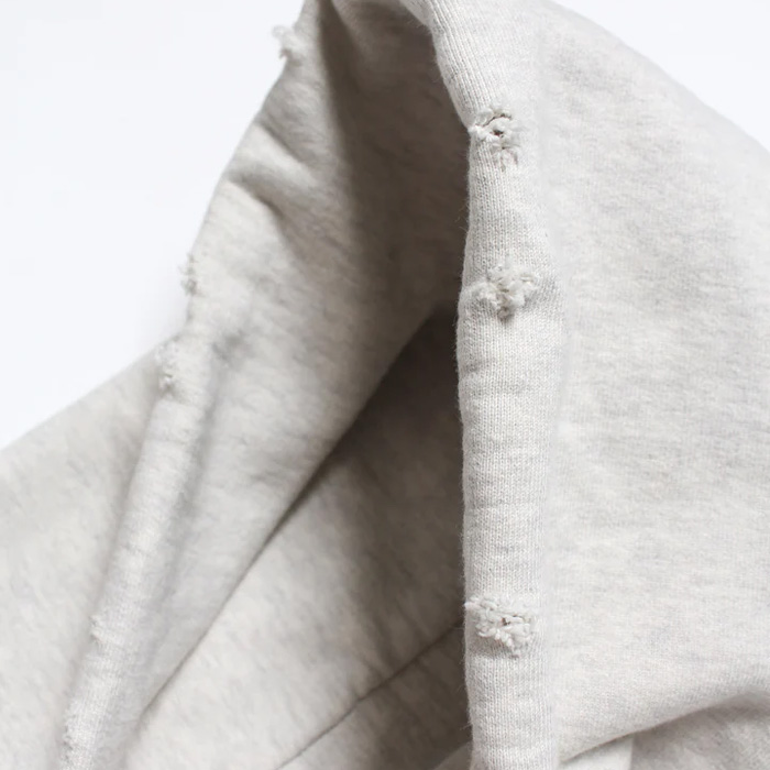 ビンテージクルースウェットの設計思想を踏まえたシルエットと縫製仕様に、起毛無しの厚地裏毛を組み合わせ、ラフさと重みのある着用感を両立。フロッキープリントの表情が自然に馴染むバランスに仕上げている。
