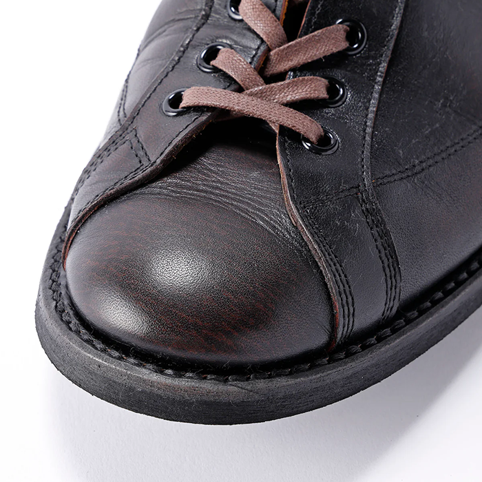 顔料を一切使わず、イタリア製のオイル染料のみで丁寧に染め上げることで、履き込むほどに深みのあるブラウンが自然に現れ、時間とともに豊かな表情へと変化していきます。荒々しさだけでなく、どこか艶やかで洗練された茶芯の表情を楽しめるのが、このモデルの大きな魅力です。