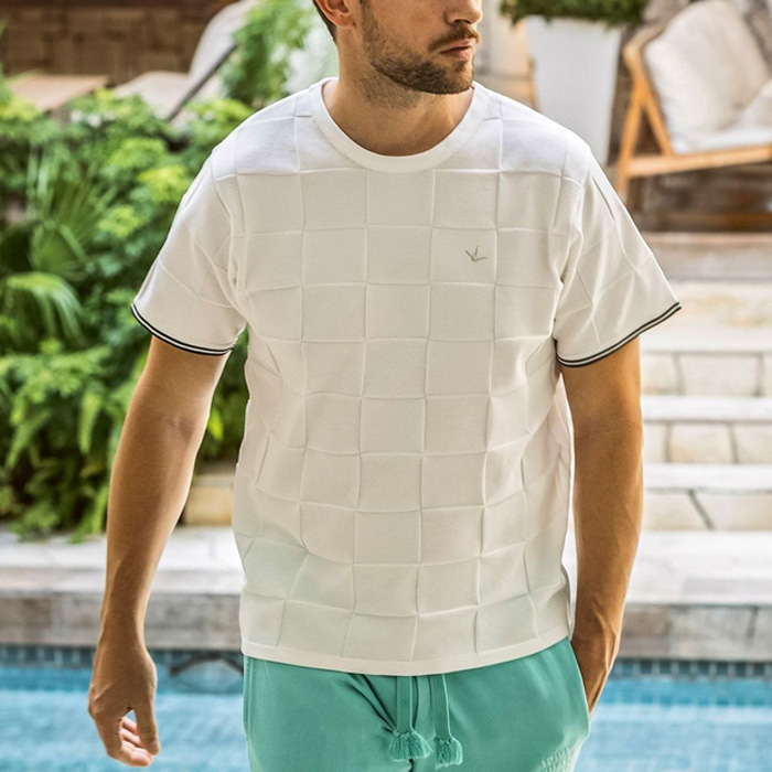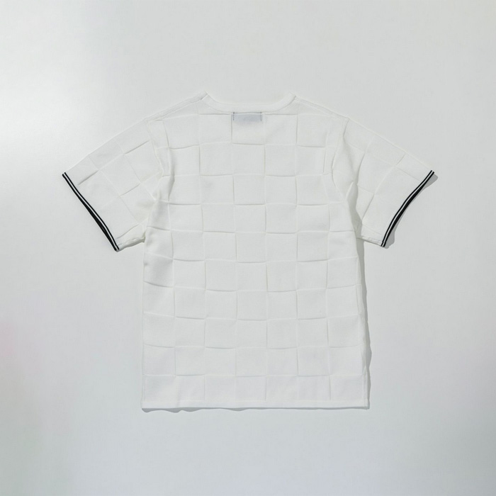 編み込んだような立体的なブロックデザインがクラス感を漂わせる、オリジナルテキスタイルで仕立てたカットソー。