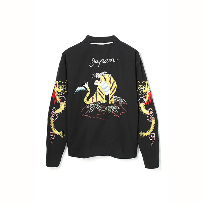 手振りミシンによる職人技が光る、迫力ある刺繍のスーベニアジャケット。 繊細なグラデーションと重層的なステッチワークがモチーフに奥行きを与える。 ボディには軽やかなムラ感のコットンファブリック、ライニングには光沢のあるレーヨンサテンを使用。 身幅が広くショート丈のクラシックなボックスシルエットで、ヴィンテージの雰囲気を表現。 ストレートスライダーのUNIVERSALジッパーとハンマー加工のドットボタンでクラシカルな仕上がりに。