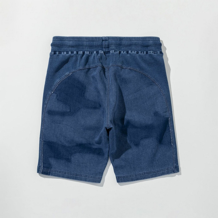ブランドアイコンとなるカモフラージュ柄にインディゴ染めのニュアンスを掛け合わせたハーフパンツ。