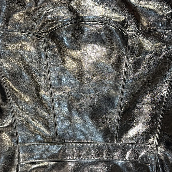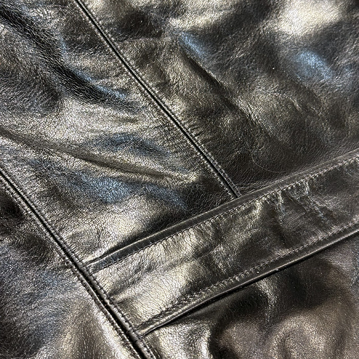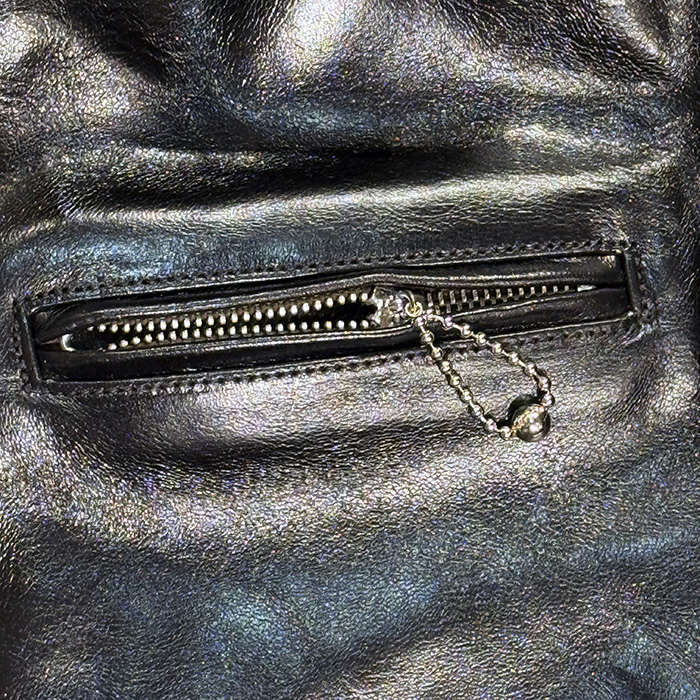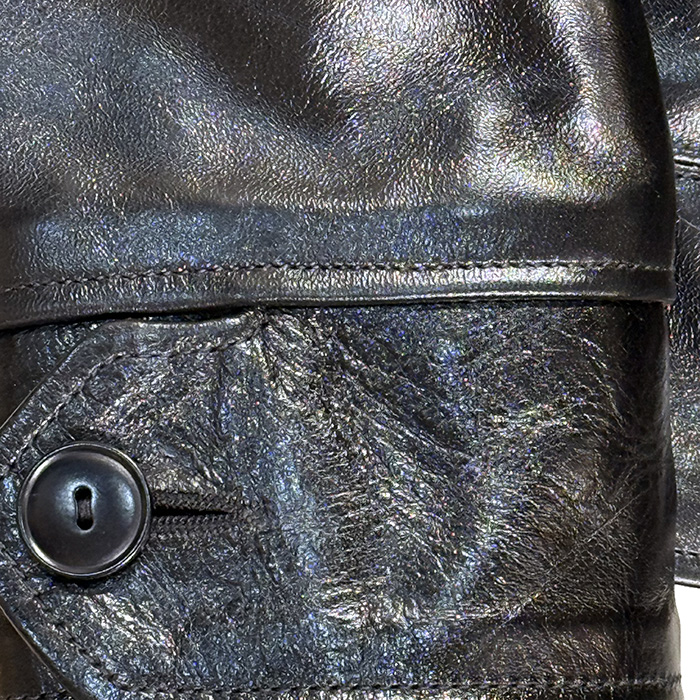 ベースは茶芯染めのブラックレザー。仕上げには水性ラッカーを採用しており、着込むほどに下地のブラウンが現れ、深みのあるエイジングを楽しめるのも魅力です。