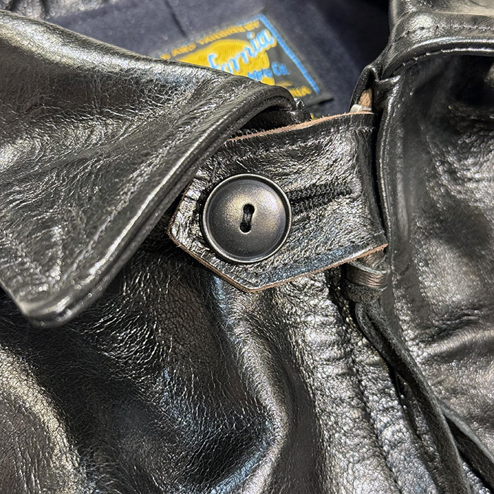 胸ポケットにはオリジナル刻印入りのボールチェーンを取り付け、ボタンには削り出しの御椀型ナットボタンを使用。細部までこだわり抜かれたディテールがヴィンテージレザージャケットの雰囲気を高めています。