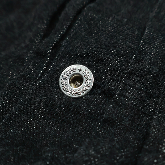 WWII model denim jacket made with the standard 11.5oz black denim. This is the first attempt at a WWII model using black denim. Using tonal stitching in the same color as the fabric makes for refined detailing and easy styling. Features newly produced original iron donut buttons with arabesque pattern, unmarked punch-through rivets, and front pleat stitching dimensions, faithfully covering WWII-era details. Sewn with strong, precise thread tension to emphasize puckering rather than adopting the amateur stitching often seen in wartime models. The length is 1cm shorter than the standard jacket, and sizes 44 and up come in a T-back specification.