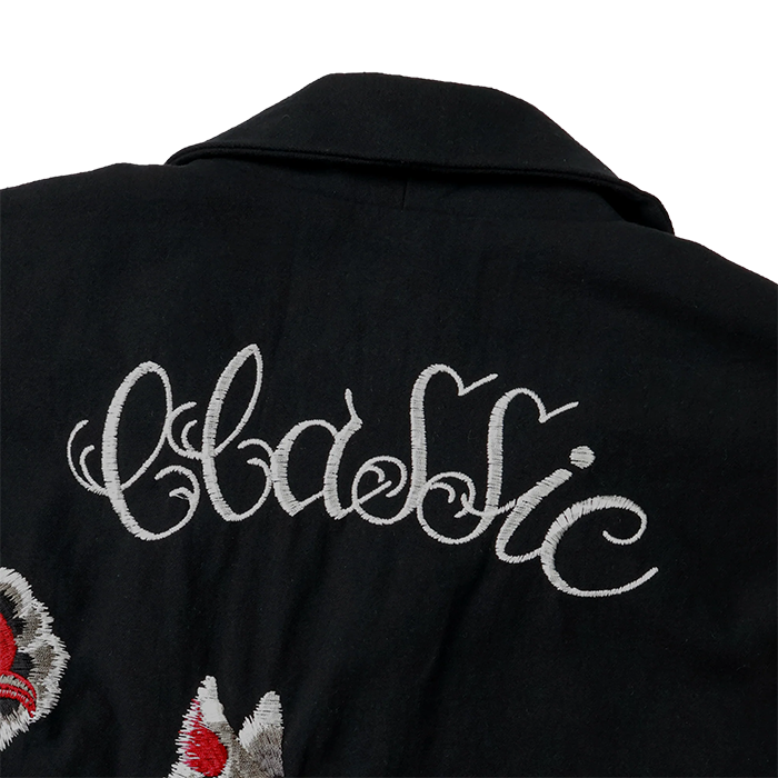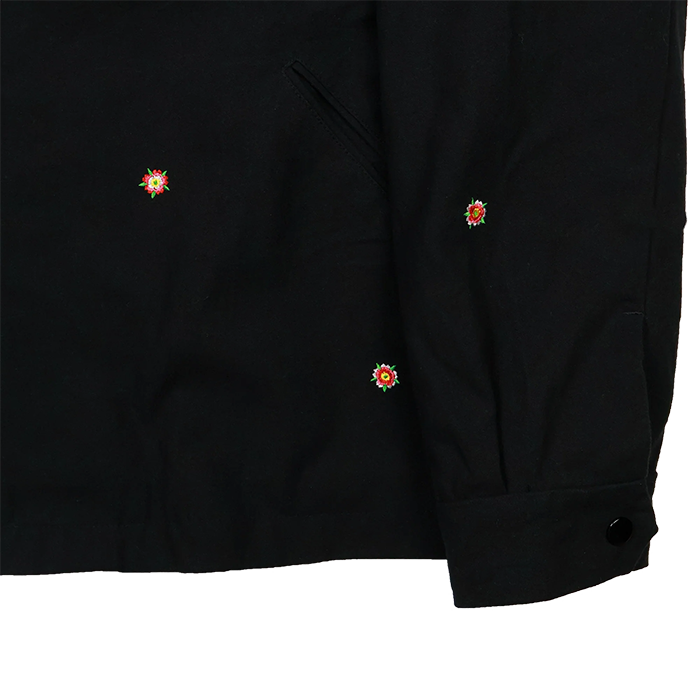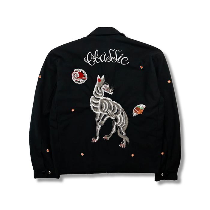 FULLCOUNT × 彫だいコラボレーションアイテム。50~60年代のアメリカで幅広く愛用されていたスポーツジャケットをベースに強撚で織り上げたブラックミリタリーチノを特殊な製品洗いを施すことで、古着のベトジャンの様な落ち感を表現。裏地付き胸ポケットあり、オールドスクールながらも機能性に富んだディテールです。刺繍に関して、桜吹雪の様に全体にちりばめられた桜は良く見ると、デザインが二種。背面の狼の毛並みや龍の鬣は不規則な刺繍のピッチによって躍動感が印象を与えます。彫だい「コラボの話が決まり、まず龍のデザインを提案させて頂きました。その後、辻田さんが僕のタトゥー作品の中からピックアップして頂き、アートワークに起こしました。凄く気持ちのいい思い出として僕が刺繍に起こしやすいデザインを出した時に、【刺青のままのデザインで】と言ってもらい、いつも通りの楽しいデザインをセッションしながら作れたのが今でも鮮明に覚えています。 最高の時間でした。」