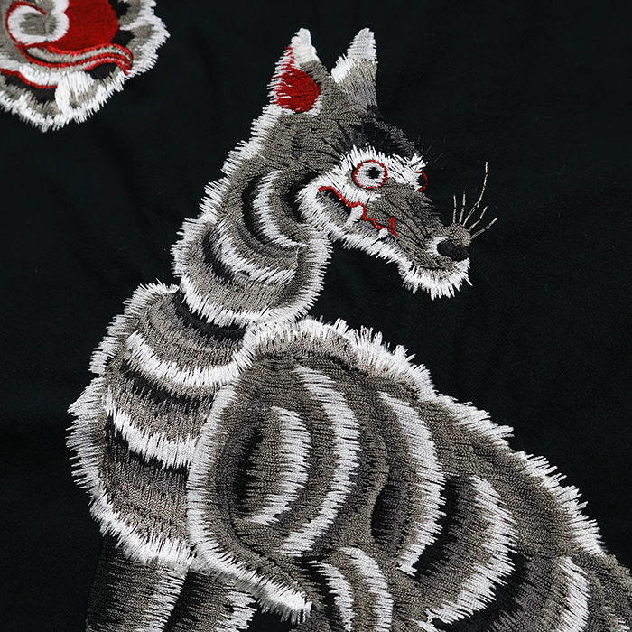 The embroidery features two distinct types of cherry blossoms scattered across the garment like petals, while the wolf’s fur and the dragon’s mane on the back are brought to life through irregular stitch pitches, creating a dynamic impression.