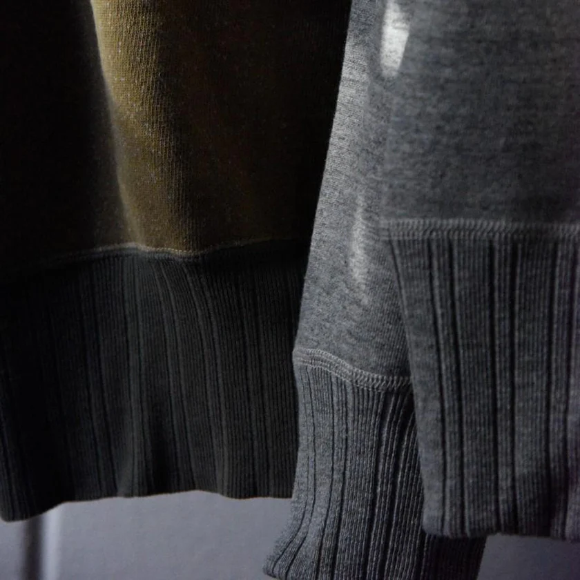 クルーネックのネック周りに後からつけられたフード ” 後付けパーカ“と呼ばれるアイテムです。ジンバブエコットンの原綿(茶綿)を先染めした贅沢な吊り裏毛を使用することで、原綿の肌触りを直で楽しむことが出来ます。盛り上がった2本針の縫製を現代では”かまぼこ”とよばれ、良くない縫いとされていますが、あえてかまぼこにすることで40年代の表情が再現されます。