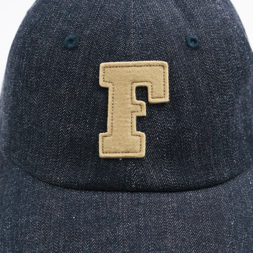 定番6843デニムキャップよりも浅めのクラウンを作成し、更にクラシックなベースボールキャップの形に近づきました。1900年代初期のデジタル化されていないフォントで作製した「F」の厚盛フェルトワッペンなど細かい箇所まで作り込んだキャップです。