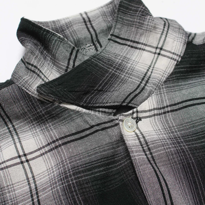 1940年代の深緑をベースとしたチェックレーヨンシャツを背景に、古い時代特有の佇まいを色濃く残した一着。所々に見られる細かなプリーツや、やや大きい広がった衿の形状などから、一段古い時代の趣を感じさせるディティールを踏襲している。 擦り切れるまで着込まれ、リペアを重ねながら大切に着続けられてきた様子をイメージし、補修痕や経年の表情まで含めてリアルに表現している。