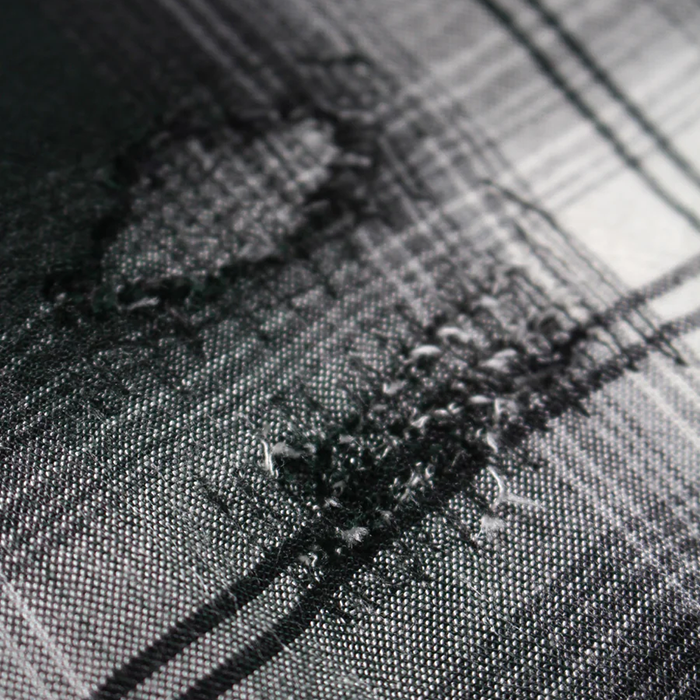Inspired by a deep-green 1940s rayon plaid shirt, carrying the unmistakable presence of an earlier era. Fine pleats and a slightly larger, spread collar echo period-correct detailing. Imagined as a piece worn to the point of fraying and carefully kept through repeated repairs, with mending traces and aged expression rendered with realism.