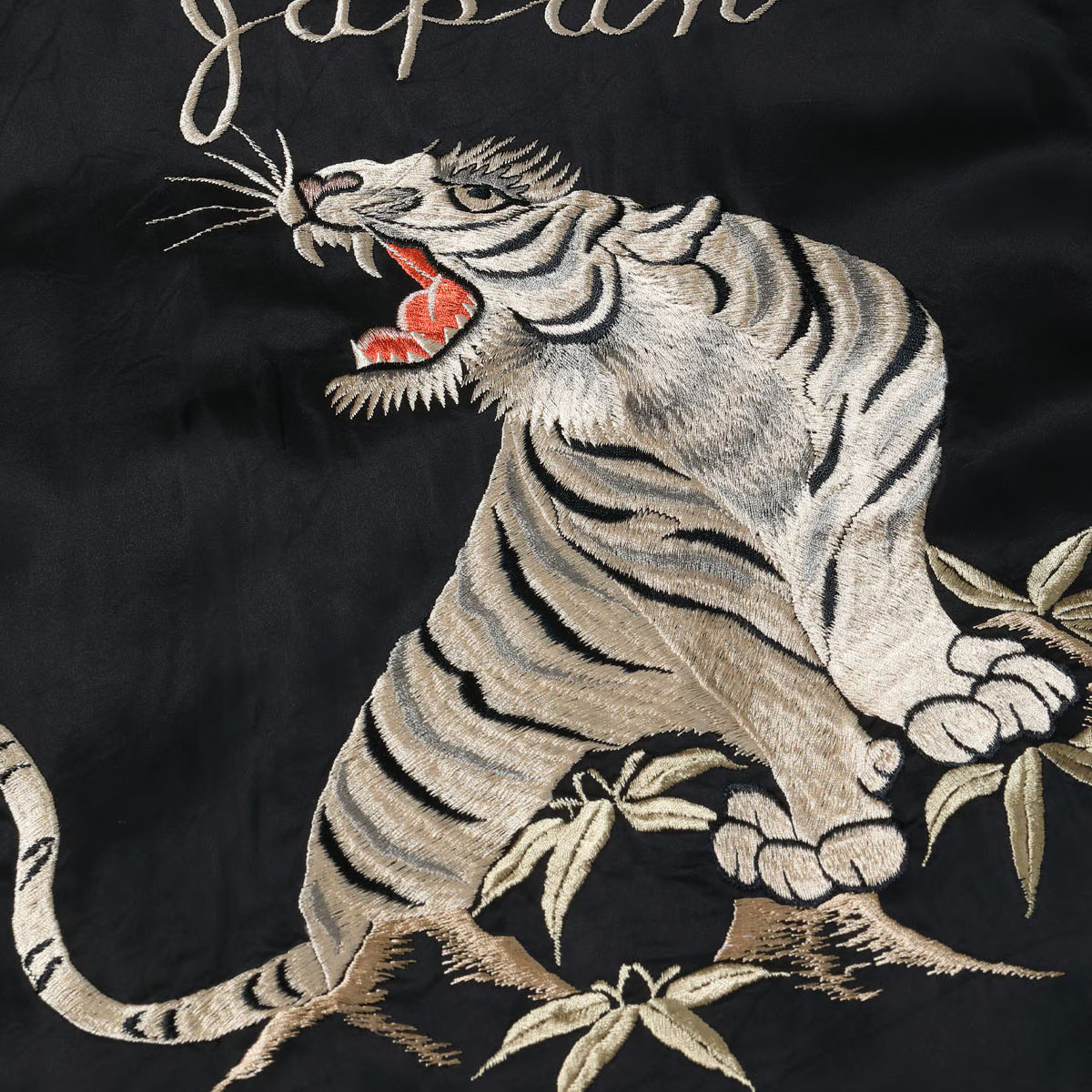 こちらはテーラー東洋独自のアレンジを加えたモデルで、表面は黒一色のボディに白虎が咆哮する絵柄。元にしたヴィンテージはカラフルな配色であったが、本作はモノトーンに仕上げた。刺繍は白の色糸を基調としつつ、箇所により針足の方向を変えて筋骨隆々とした虎の体躯を表現。さらに部分的にグレーや黒を差して立体感を強調している。下部の笹の葉や岩肌は一見すると虎と同色に見えるが、実はそれぞれ色味を変えており、計7種類の色糸を使い分けた贅沢な刺繍が特徴。