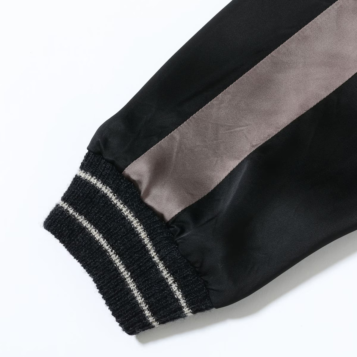 対してリバーシブル面はジャパンマップ柄。褪色したヴィンテージの魅力的な色味から着想を得たパープルグレーのボディに、黒一色で日本地図と龍を刺繍している。ヴィンテージは多色であったが横振り刺繍の立体感により単色でも絵柄の迫力が損なわれることはなく、身頃のグレーより袖下のブラックの方が濃い「逆配色」のボディに載せることで上品に。1940年代当時も同じ刺繍型で配色違いのスカジャンは作られており、ヴィンテージの刺繍の魅力とオリジナルの配色の魅力を兼ね備えたスペシャルな一着に仕上がっている。