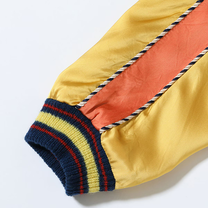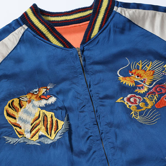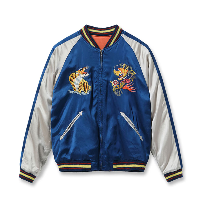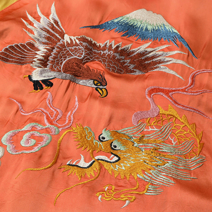 こちらはヴィンテージの完全復刻モデルで、表面は富士山を背景に鷲と龍が睨み合う絵柄。背中の上部に「Japan」の文字が無いためそれぞれのモチーフが通常よりも大きく描かれており、針足の方向を細かく変えて大きく広げた鷲の翼の立体感や迫り来る龍の体躯の遠近感まで緻密に描写している。また鷲のクチバシや爪、龍の口など部分的に黒い色糸を差すことで絵柄の迫力を強調。非常に珍しいオレンジ×イエローのボディに刺繍が映える。
