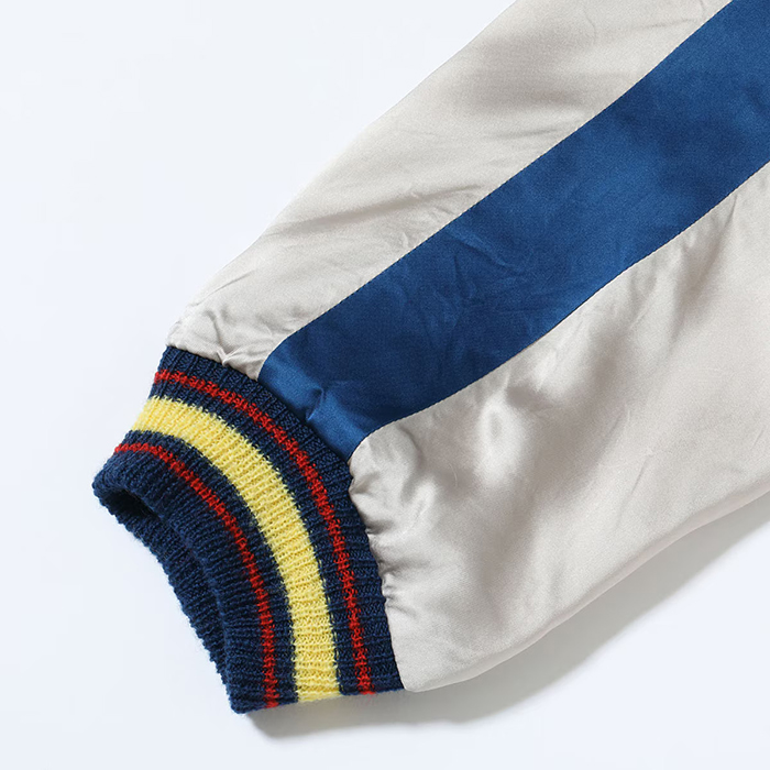 テーラー東洋のコレクションの中でも特に厳選した逸品をディテールにこだわり再現するのが、このスペシャルエディション。横振り刺繍で緻密に描かれた図案はもとより、アセテート生地の打ち込みを調整してヴィンテージと遜色なく仕上げ、ウールリブも旧式の横編み機を使用して1着ずつ編み上げている。リバーシブル仕様のファスナーについても50年以上前のファスニング機械を再稼働させ、当時と同じ手曲げのものを再現。テーラー東洋の前身である港商(こうしょう)商会のラベルを使い、ヴィンテージスカジャンの最盛期を彷彿とさせる仕上がりとなっている。