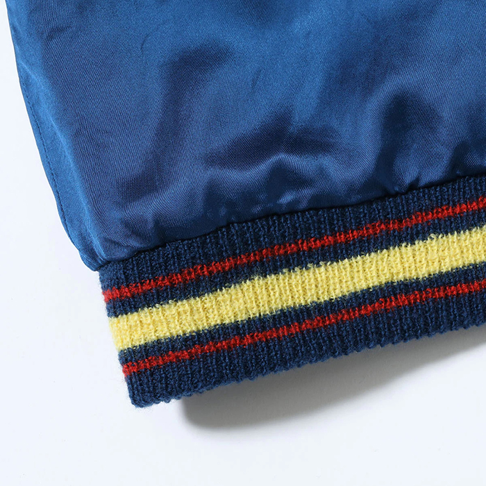 対してリバーシブル面はジャパンマップ柄。海を想わせる鮮やかなブルーのサテン生地に、日本地図を挟んで鷲と龍が睨み合う構図となっている。本作は数あるヴィンテージスカジャンの絵柄の中でも特にジャパンマップが大きく、上部のスペースが限られるため「Japan」の位置も中央ではなく北海道の横に。さらに地名の数も非常に多く、主要都市や米軍にまつわる地名を所狭しと描いている。このように贅沢な刺繍のジャパンマップ柄は他に類を見ず、港商スペシャルエディションの名にふさわしい一着と言えるだろう。