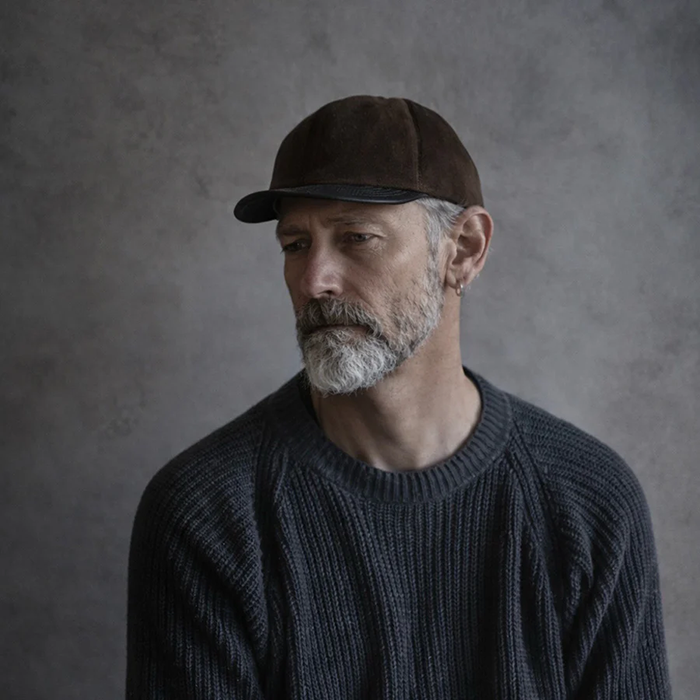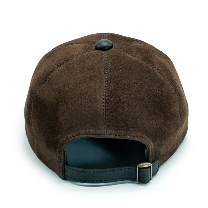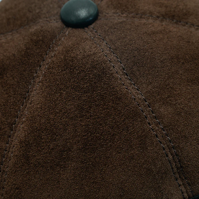 クラウンにブラウンのディアスエードを使用し、ブリムにはフルベジタブルタンニンなめしの牛革を、ブリム裏にはヌバックを使用したブリムの短いショートブリムキャップ。