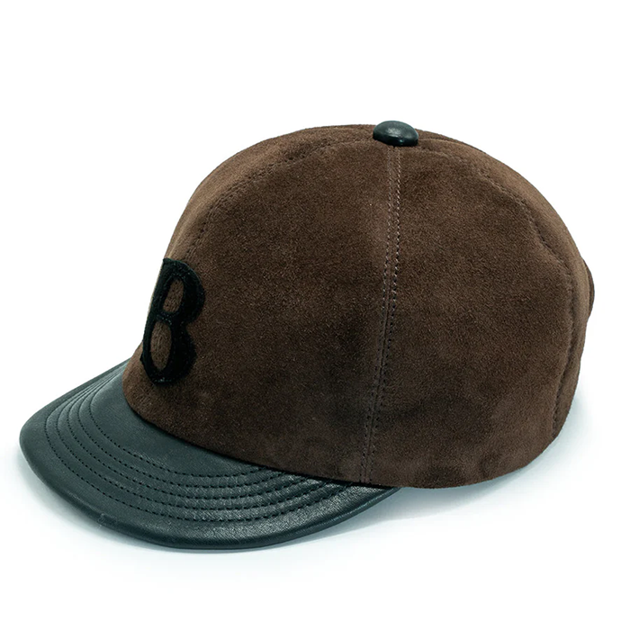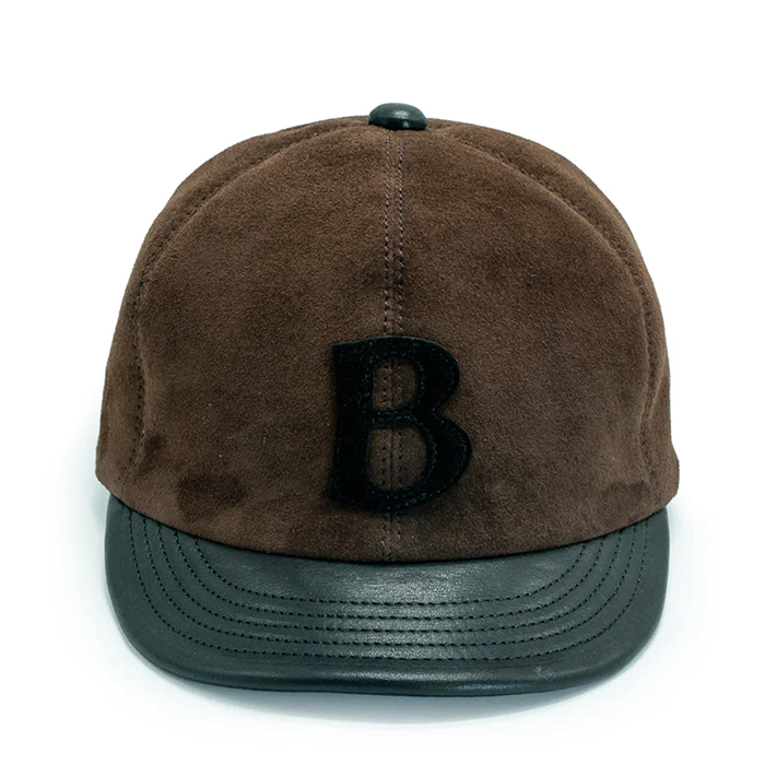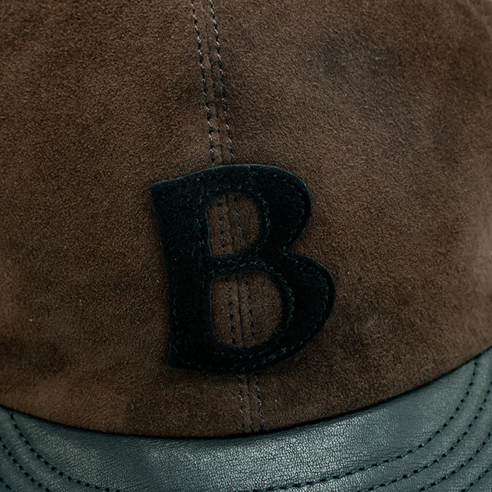 フロントにはブランドの頭文字のBをディアスエードで施し、ブリムは約4.8cmと短くデザインされているため後ろ被りにも向いています。