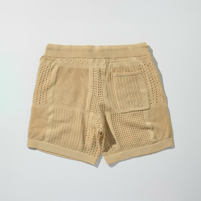 柄違いの透かし編みをブロックに配したハーフパンツ。