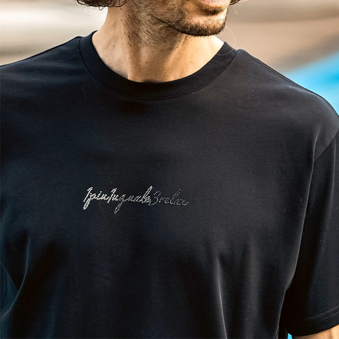 ブランドを象徴するロゴに、グラデーションで配置したラインストーンをあしらい、さりげない輝きと存在感をプラス。華やかさを持ちながらも主張しすぎない絶妙なバランスで、大人のスタイリングに自然に溶け込む一枚に仕上げています。