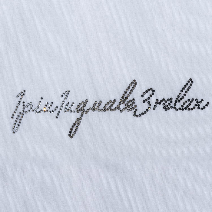 ブランドを象徴するロゴに、グラデーションで配置したラインストーンをあしらい、さりげない輝きと存在感をプラス。華やかさを持ちながらも主張しすぎない絶妙なバランスで、大人のスタイリングに自然に溶け込む一枚に仕上げています。
