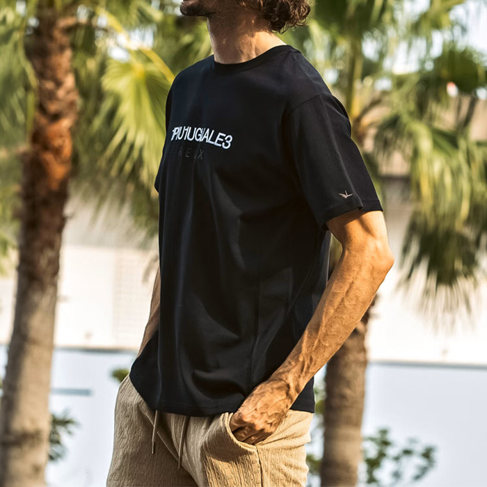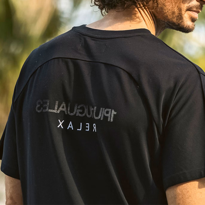 ブランドを象徴するロゴをリバースデザインで表現し、バックスタイルにさりげない存在感をプラス。グラデーションや配置にこだわることで、シンプルながらも印象的なアクセントを演出し、大人のスタイリングに自然と溶け込む一枚に仕上げています